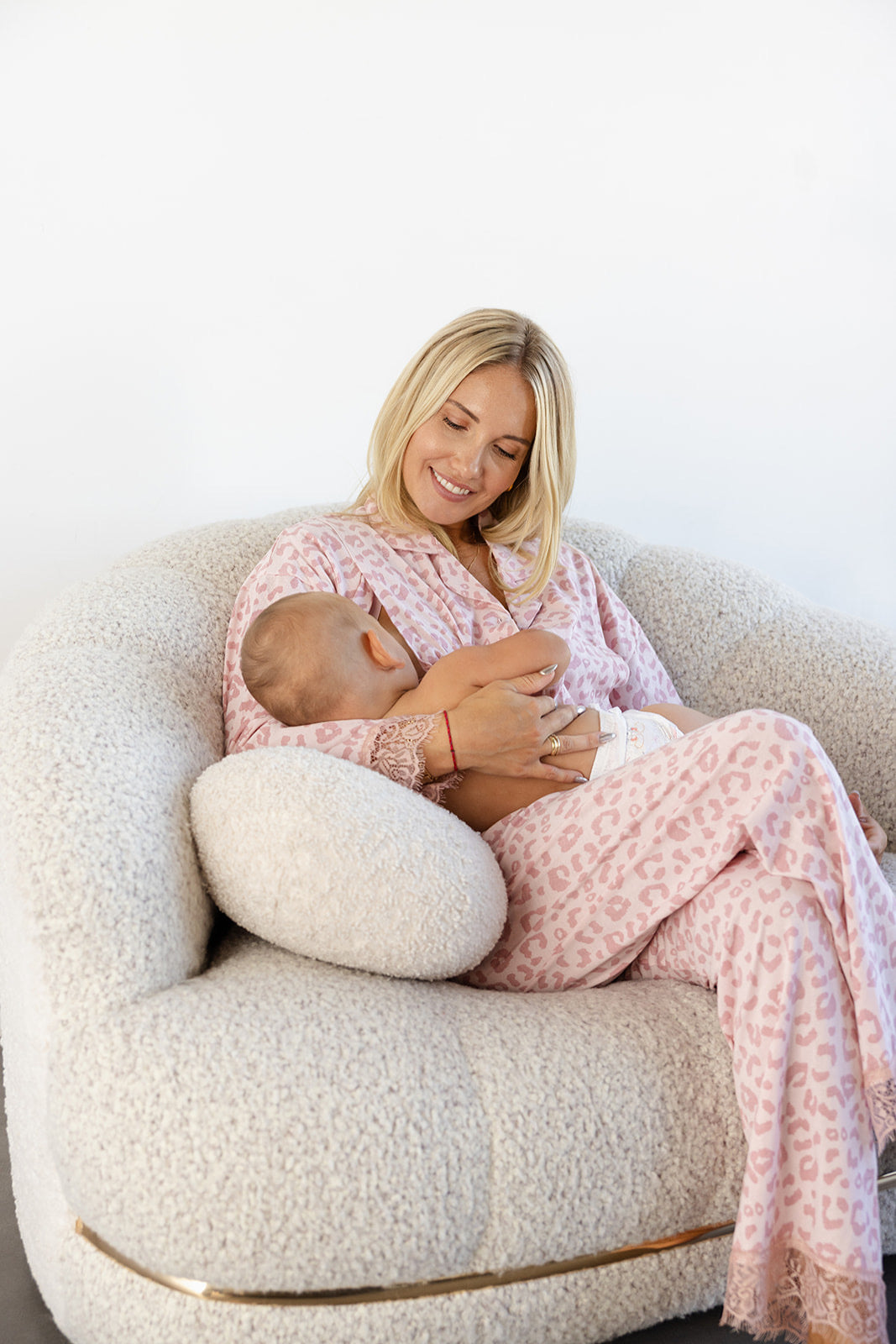 All mothers are goddesses and they’ve shown incredible grace, strength, wisdom, and ever more in all seasons of womanhood. This 100% cotton pajama set channels our inner fire with a pink cheetah print and feminine lace sleeves. With an adjustable elastic waistband, this pajama set will grow from pregnancy to beyond. A discreet side opening allows mothers for babies to nurse in comfort with their mother. This is an essential piece will liven up your wardrobe in those early days of motherhood. Eveline The Label designs maternity essentials that evolve with you in all seasons of motherhood, from pregnancy to beyond.